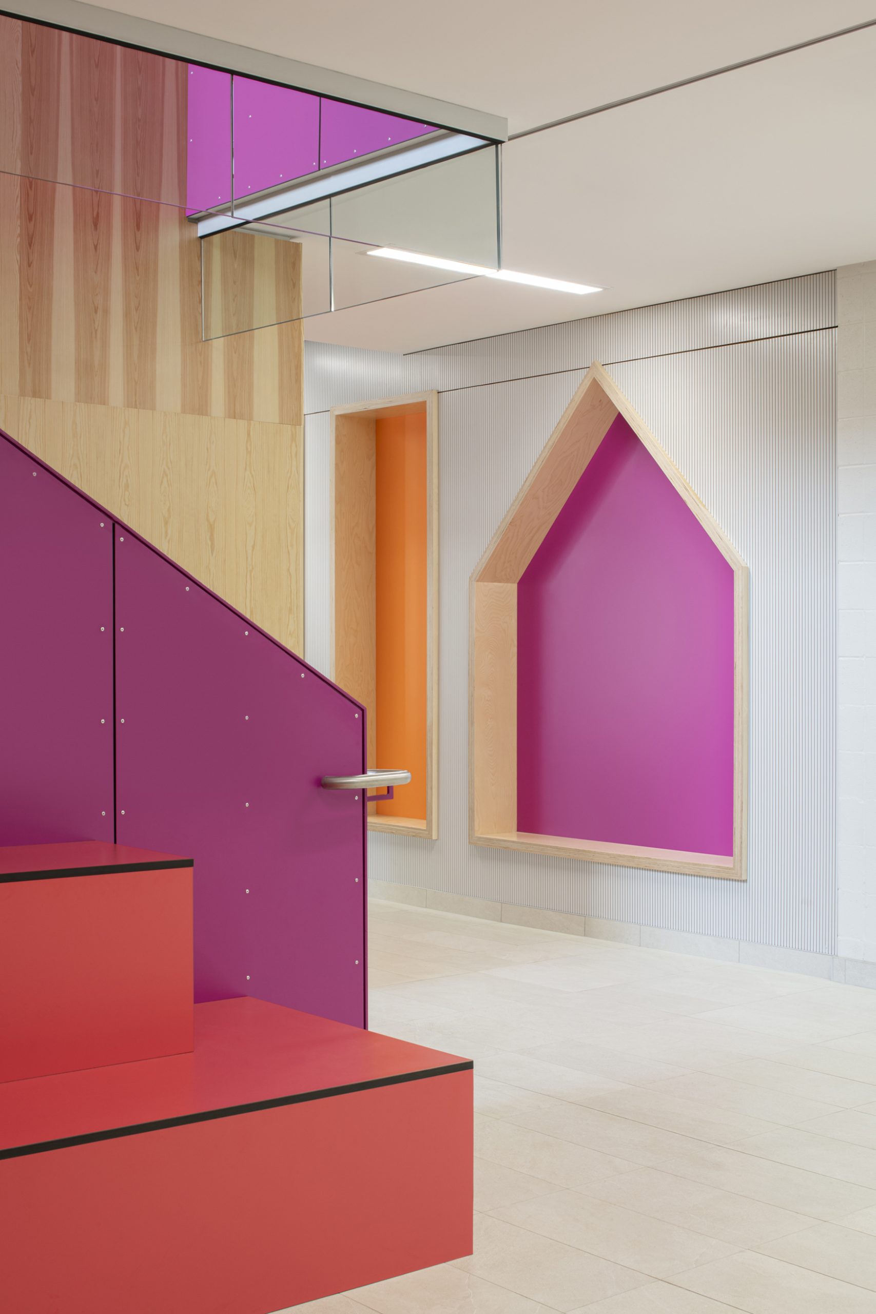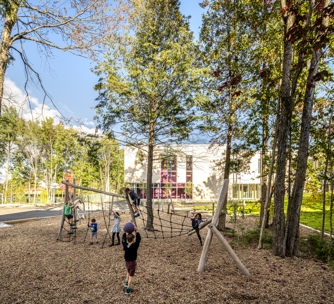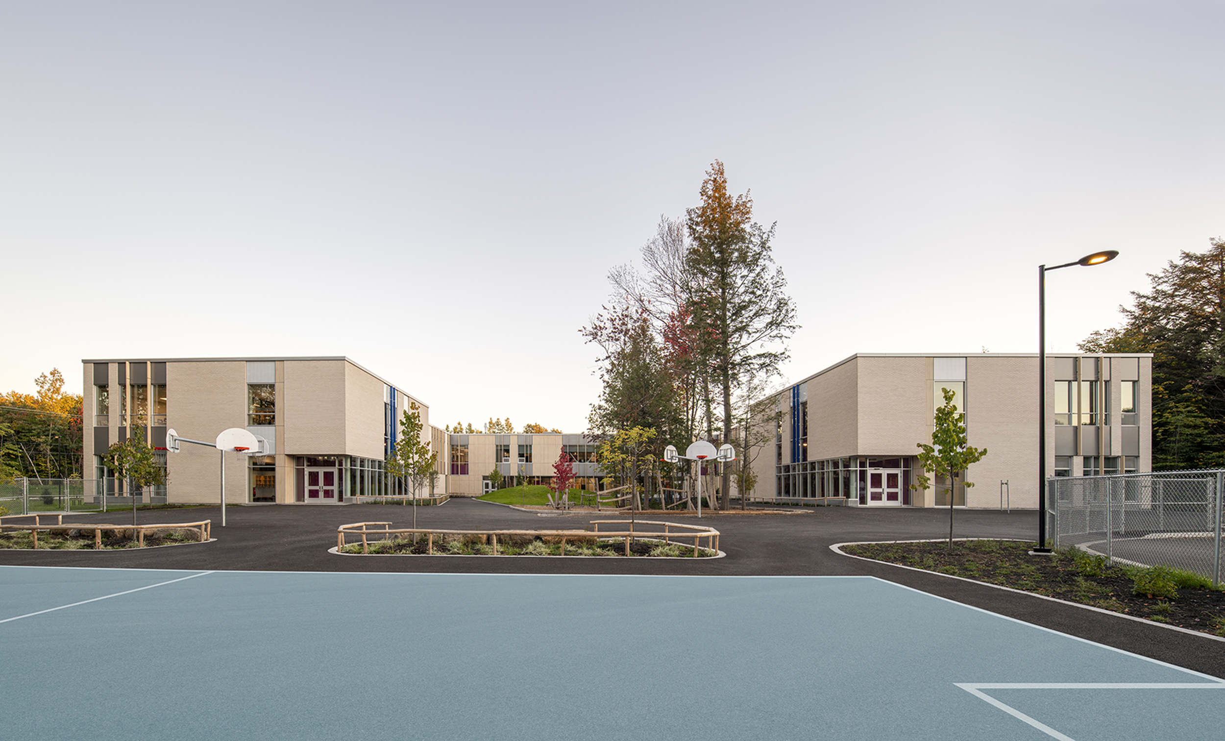 L’implantation du projet a été conçue en harmonie avec le caractère boisé du site, dans une volonté affirmée de favoriser la biophilie. La préservation d’une partie des arbres matures permet une interaction constante entre les usagers et la nature environnante. Un porte-à-faux souligne l’entrée principale du bâtiment. Le bloc communautaire, réparti sur deux niveaux, s’ouvre à la fois vers la communauté et la cour d’école. Les ailes académiques, disposées de part et d’autre du bloc communautaire, encadrent une cour intérieure centrale. La fenestration généreuse favorise l’apport de lumière naturelle tout en offrant des vues dégagées sur les arbres matures du site. Les élèves bénéficient d’environnements d’apprentissage ouverts et flexibles, complétés par des zones de détente et de socialisation aux formes ludiques, aménagées dans les corridors. Un revêtement de bois, utilisé tant à l’intérieur qu’à l’extérieur, distingue le gymnase et les autres espaces pédagogiques.
