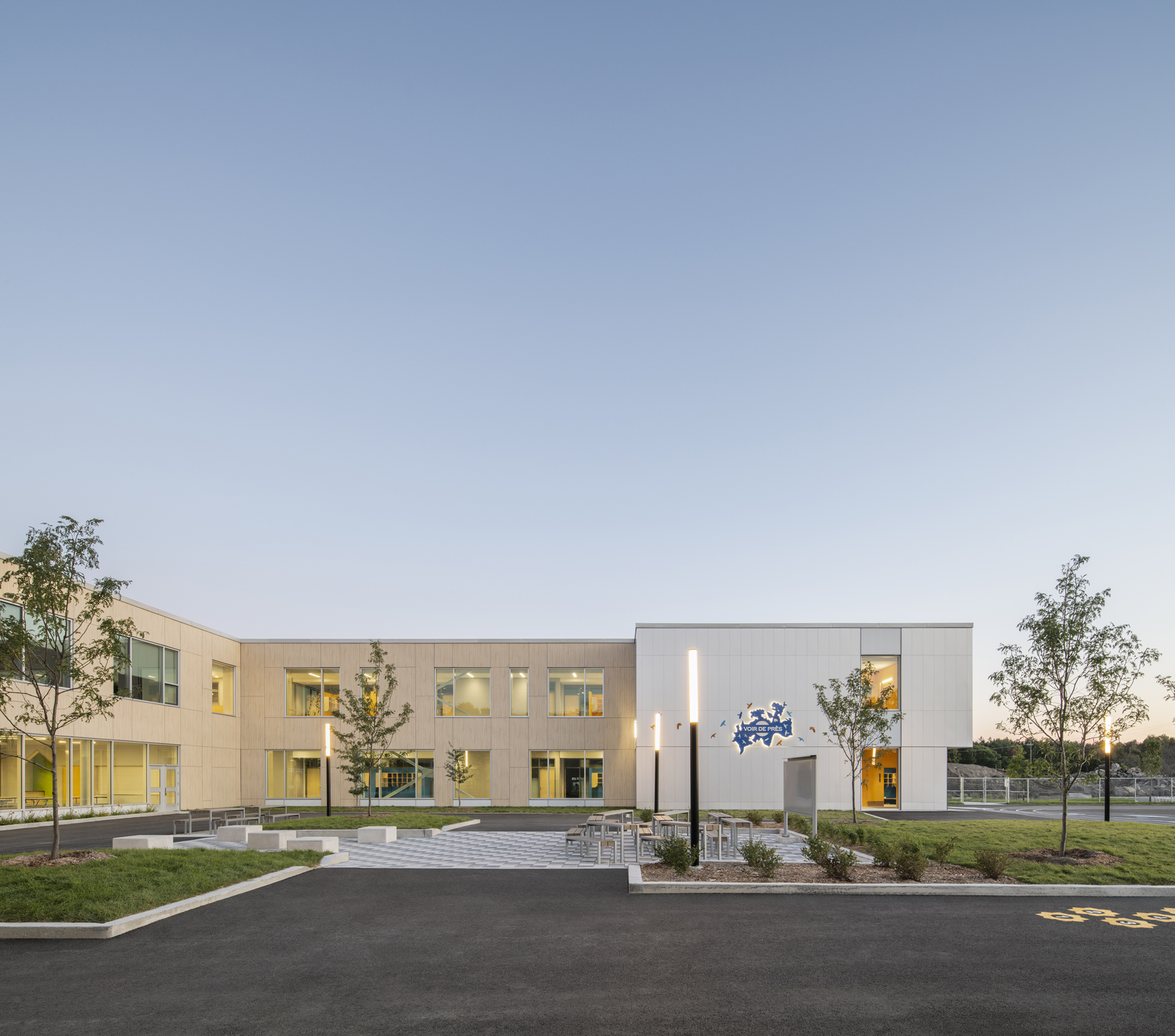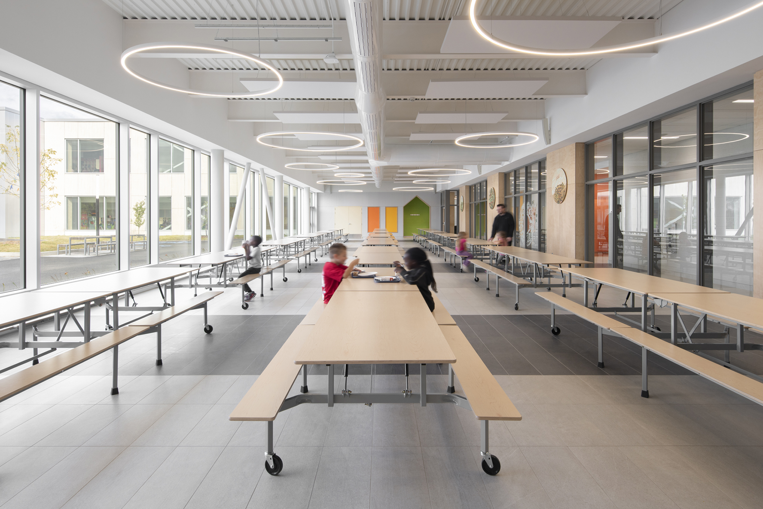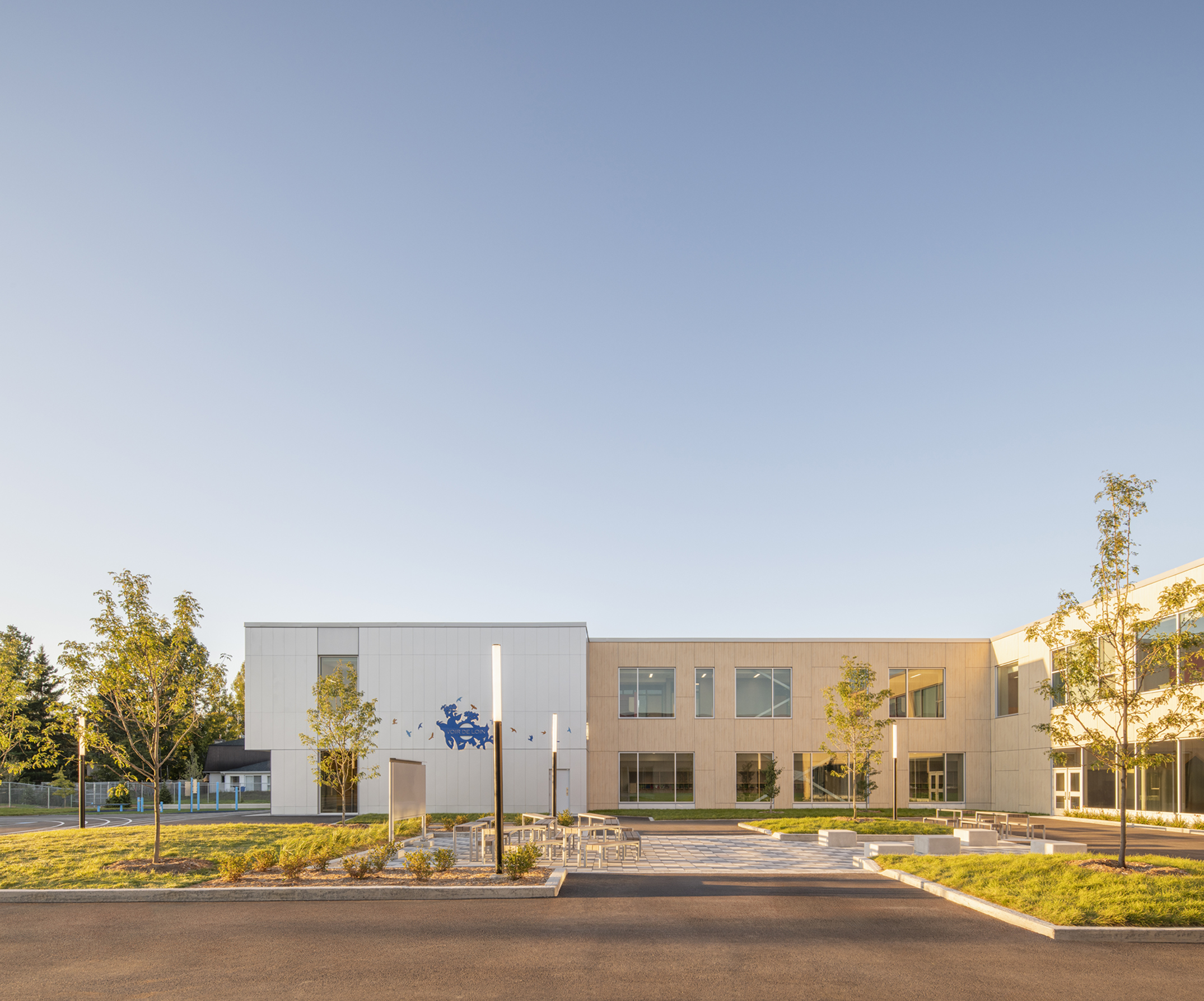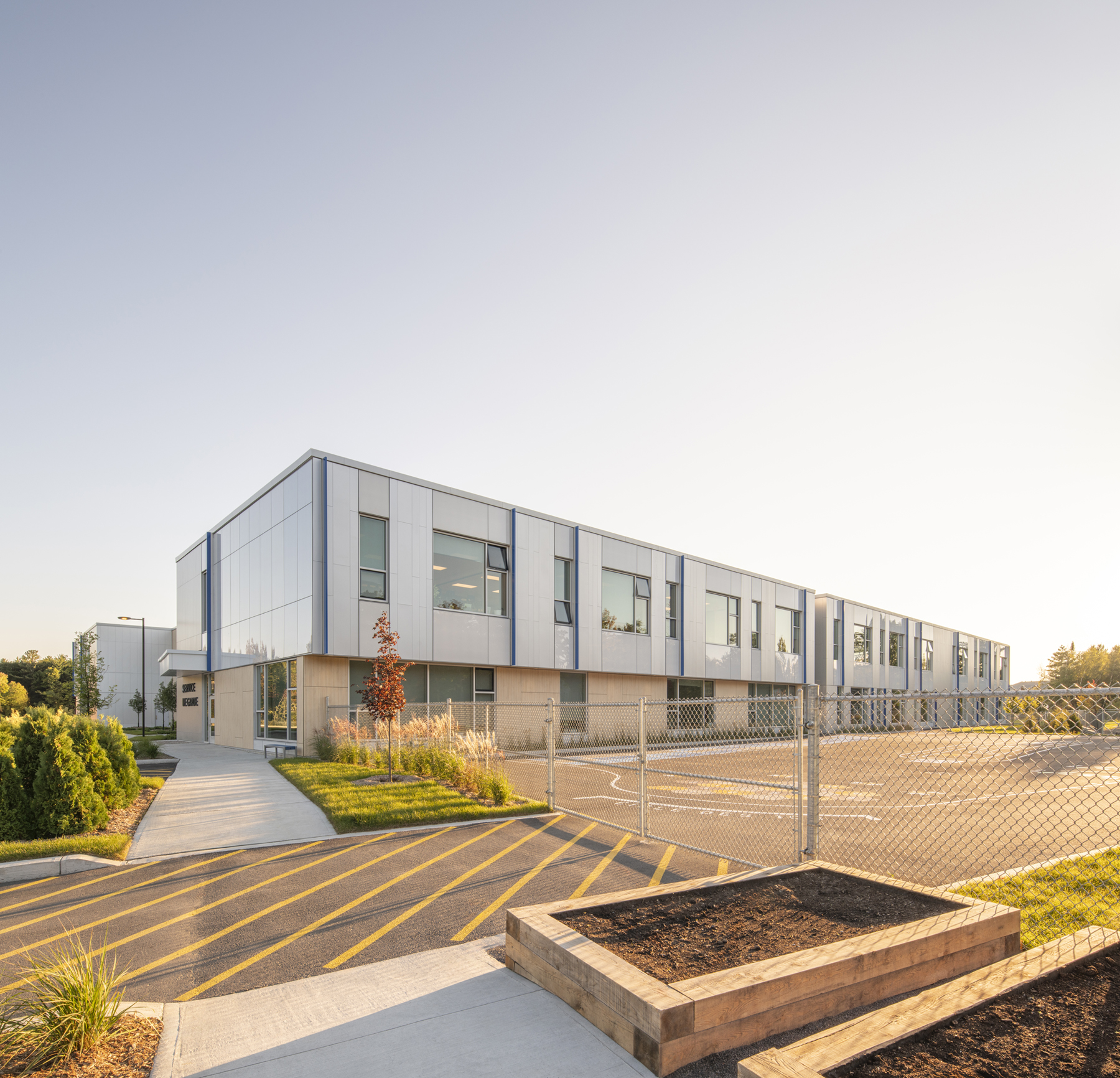 Implantée dans un quartier résidentiel en développement, l’école s’articule autour d’un noyau central regroupant les espaces communautaires (gymnase, bibliothèque, salle polyvalente, etc.) encadré par deux ailes de classes. Cette disposition crée une cour intérieure conviviale, en lien direct avec les espaces d’enseignement et les espaces communautaires. Chaque zone du bâtiment est mise en valeur par une matérialité distincte, soulignant la vocation des espaces tout en enrichissant l’expérience visuelle. Les élèves bénéficient d’environnements d’apprentissage ouverts et flexibles, complétés par des zones de détente et de socialisation aux formes ludiques, aménagées dans les corridors. À l’extérieur, la cour d’école propose des espaces variés à l’échelle des enfants : modules de jeux, classe extérieure et aires de jeux collectifs.