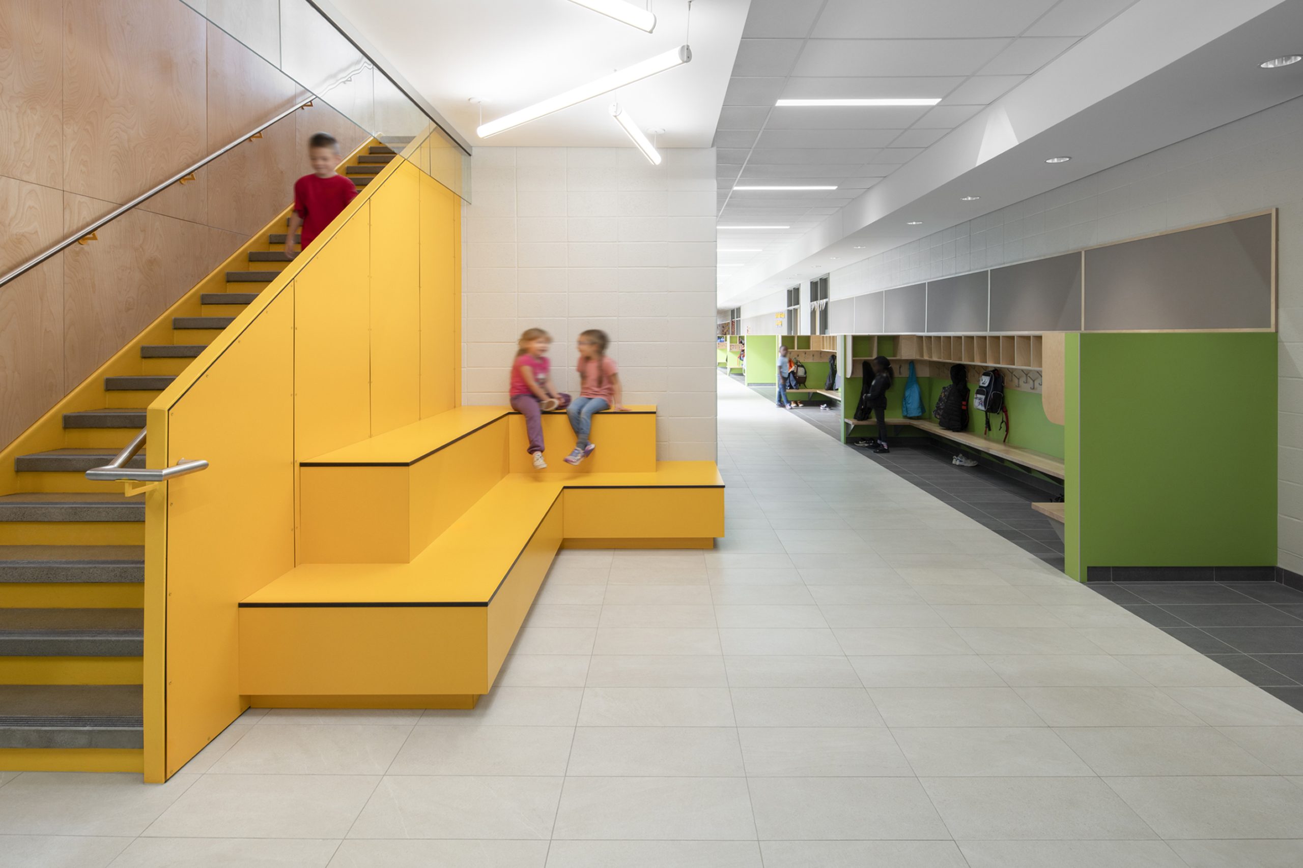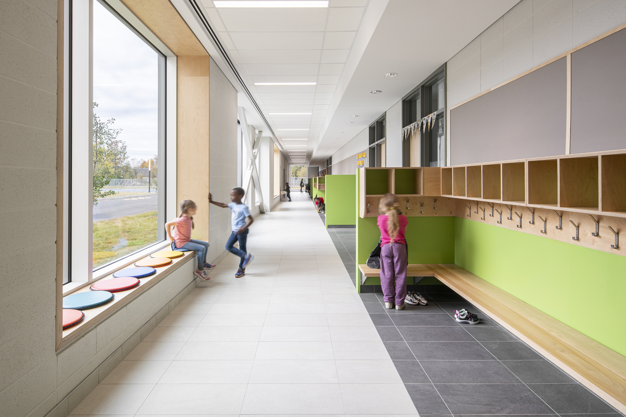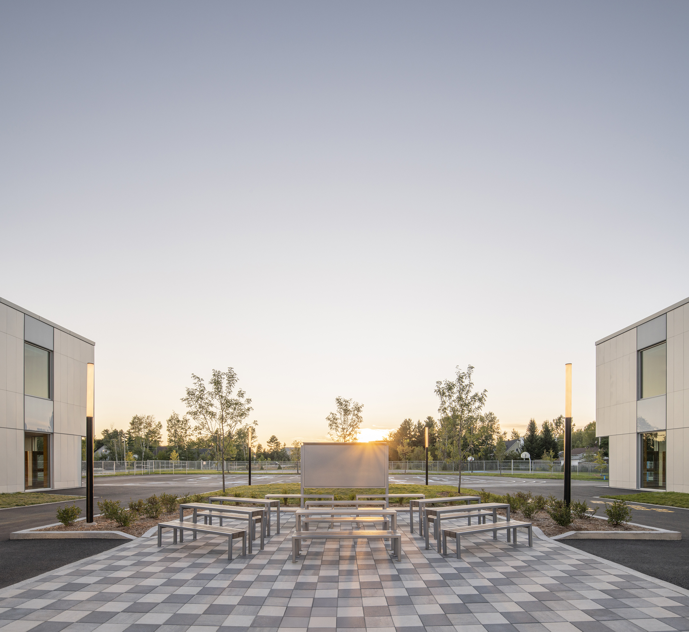 Implantée dans un quartier résidentiel en développement, l’école s’articule autour d’un noyau central regroupant les espaces communautaires (gymnase, bibliothèque, salle polyvalente, etc.) encadré par deux ailes de classes. Cette disposition crée une cour intérieure conviviale, en lien direct avec les espaces d’enseignement et les espaces communautaires. Chaque zone du bâtiment est mise en valeur par une matérialité distincte, soulignant la vocation des espaces tout en enrichissant l’expérience visuelle. Les élèves bénéficient d’environnements d’apprentissage ouverts et flexibles, complétés par des zones de détente et de socialisation aux formes ludiques, aménagées dans les corridors. À l’extérieur, la cour d’école propose des espaces variés à l’échelle des enfants : modules de jeux, classe extérieure et aires de jeux collectifs.