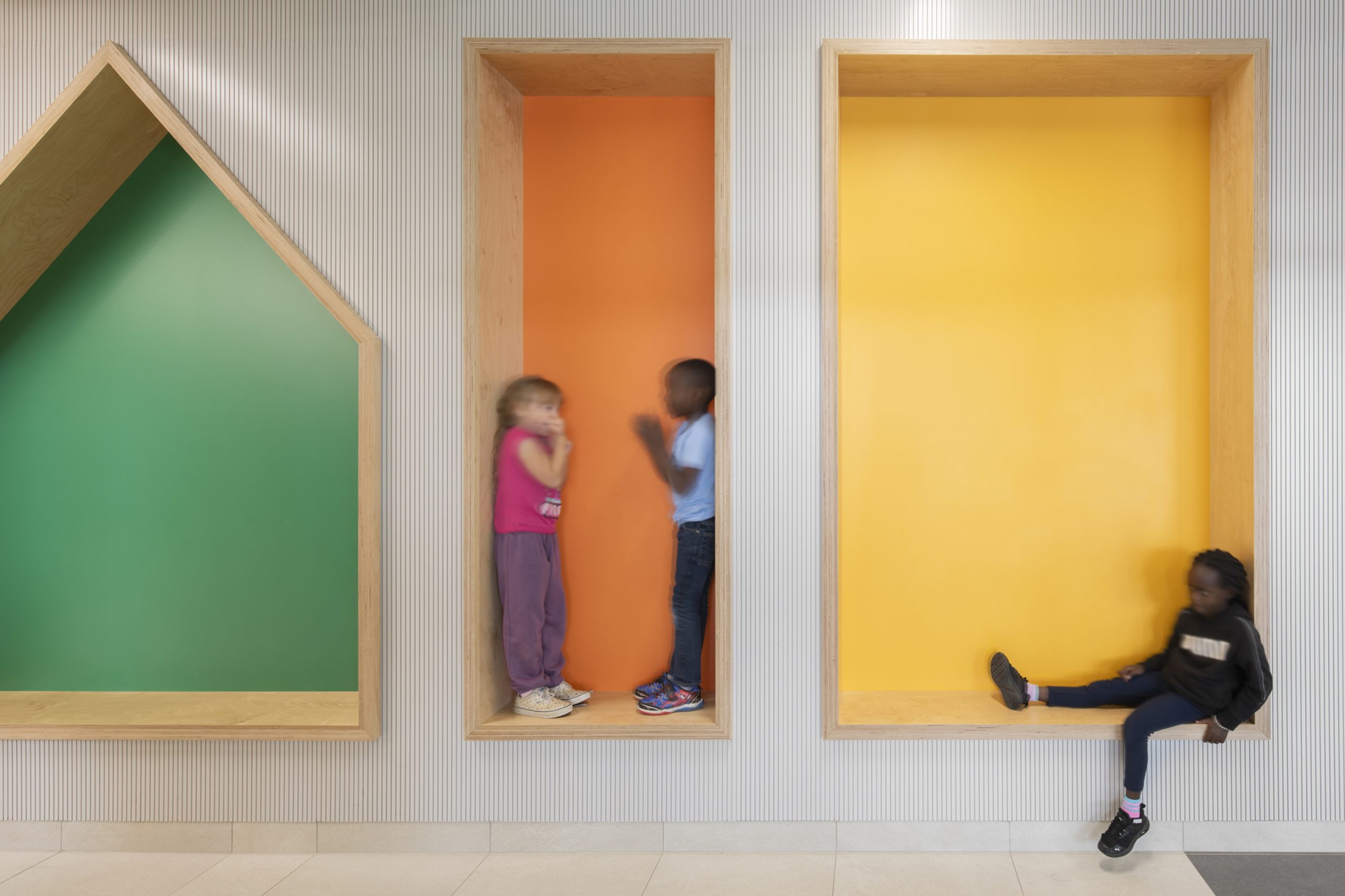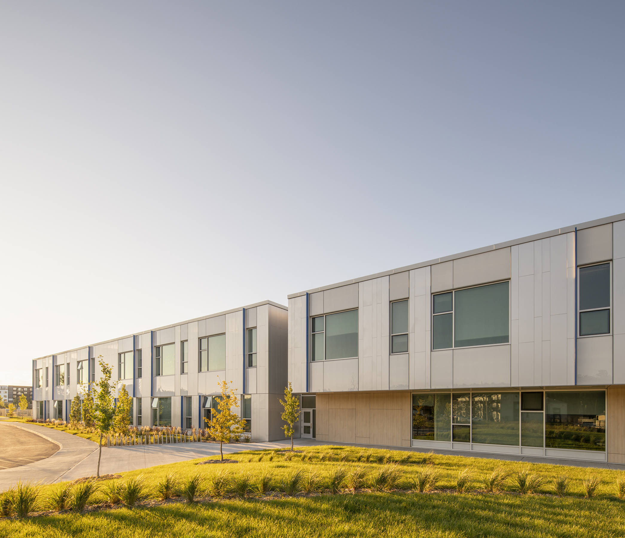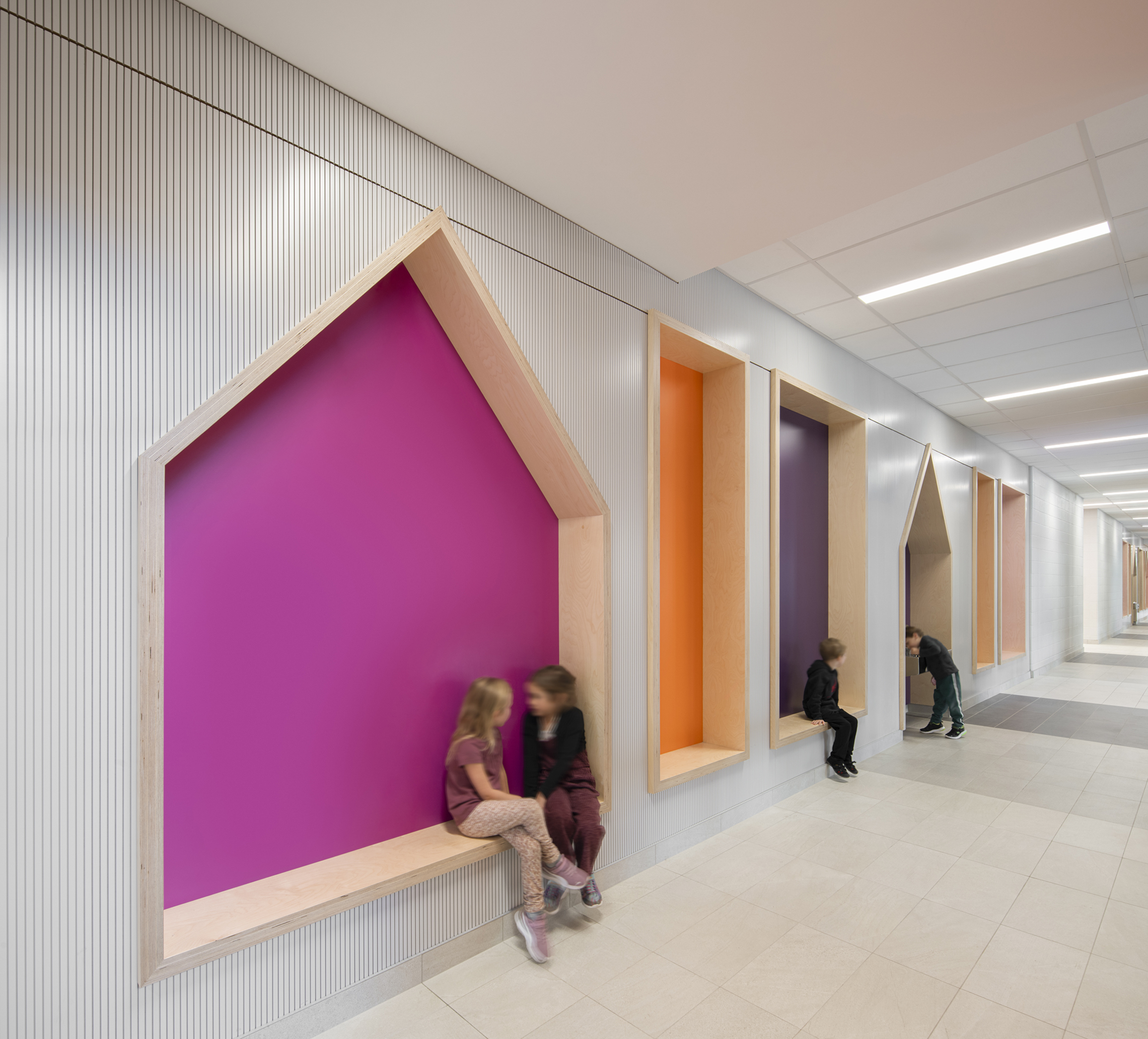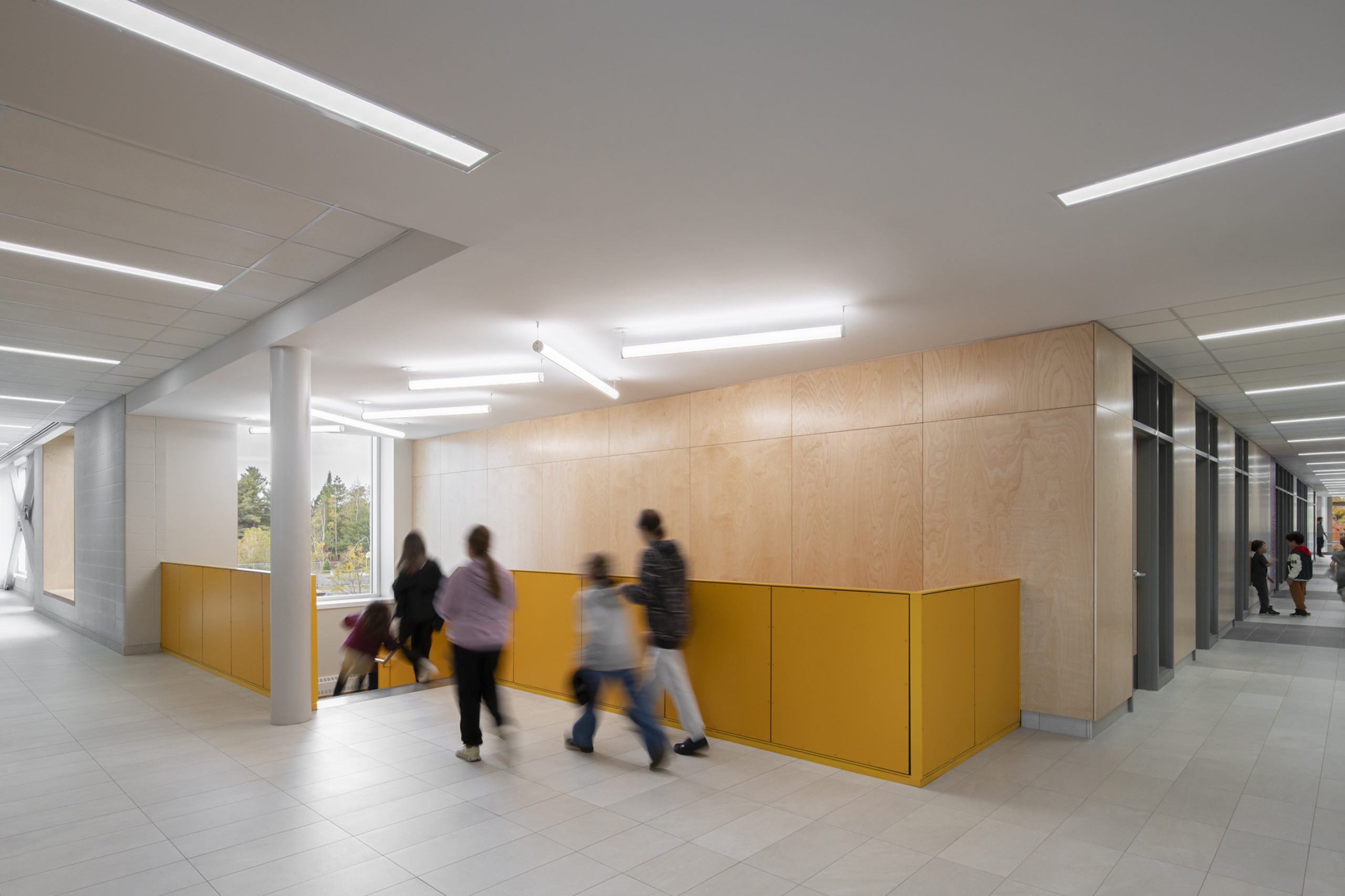 Implantée dans un quartier résidentiel en développement, l’école s’articule autour d’un noyau central regroupant les espaces communautaires (gymnase, bibliothèque, salle polyvalente, etc.) encadré par deux ailes de classes. Cette disposition crée une cour intérieure conviviale, en lien direct avec les espaces d’enseignement et les espaces communautaires. Chaque zone du bâtiment est mise en valeur par une matérialité distincte, soulignant la vocation des espaces tout en enrichissant l’expérience visuelle. Les élèves bénéficient d’environnements d’apprentissage ouverts et flexibles, complétés par des zones de détente et de socialisation aux formes ludiques, aménagées dans les corridors. À l’extérieur, la cour d’école propose des espaces variés à l’échelle des enfants : modules de jeux, classe extérieure et aires de jeux collectifs.